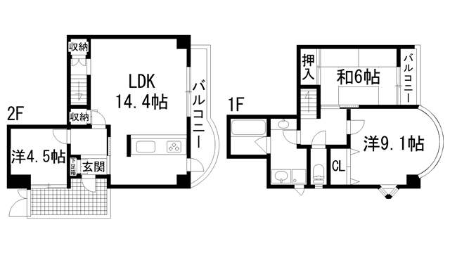和室6帖、洋室9.1帖、洋室4.5帖、LDK14.4帖 |